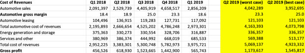 What about the cost of generating these revenues? One of the most important factors is the automotive gross margin. In quarters (Q3, Q4 2018) where Tesla reduced its inventory, automotive gross margins were 23.3% and 25%, whereas in the 3 quarters (Q2 and Q2 2018, Q1 2019) where inventory increased, gross margins were 18.4%, 18.9%, and 18.6%. Because of the inventory-gross margin association, I’ll assume that in Q2 2019, gross margins will be at worst, 23.3%, and at best, 25%. Based on these data, the cost of revenues for automotive sales is $4.042 billion at worst, and $3.953 at best.
